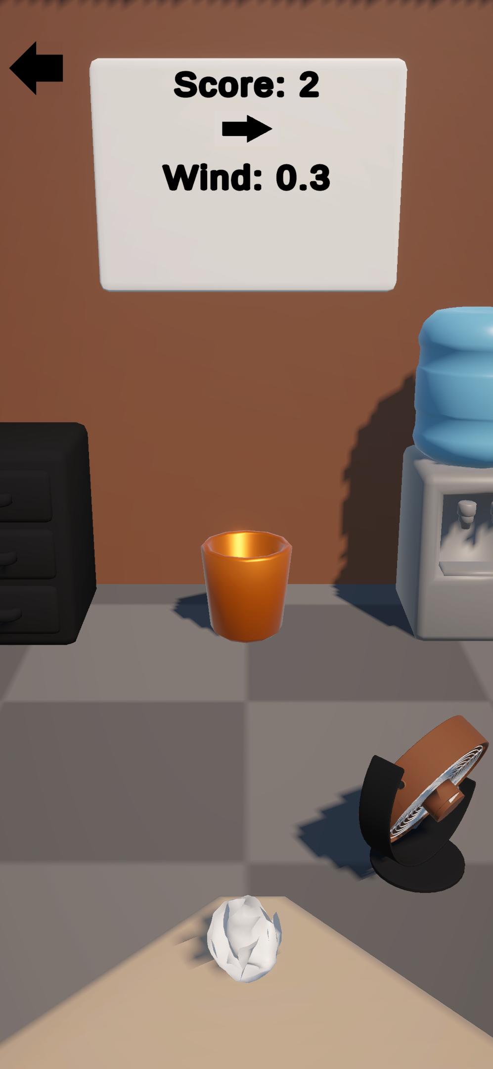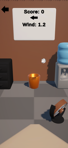 Paper Toss is a physics-based arcade game where players swipe to launch paper balls into a target bin. The core gameplay revolves around mastering swipe controls to adjust throw force and spin while compensating for a dynamic wind system that changes strength and direction every few turns. The game features realistic physics interactions, haptic feedback for immersion, and a networked global leaderboard that allows players to save their high scores and compete with others worldwide.